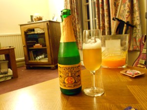 This is a fairly rare beer to get ahold of, I’ve been on a sour beer kick lately and I wanted to try a real sour beer that wasn’t backsweetened like the Kriek. I scored this beer at Beautiful Beers in Bury St. Edmunds, UK for a great price. There’s a very nice gentleman there that really knows and loves beer! I wanted to experience this beer right unlike the previous wild beer experience I had at Benson & Blakes. So I opted for a Flute this time as I felt it was appropriate for this style of beer. This is my first Gueuze experience, and I cooled the champagne like bottle down to 39*F (4*C) from its prior cellar temperature, and held it there for 48 hours before I even considered drinking it. I patiently removed the bottle cap and popped the cork from the bottle, it’s very evident that this beer is extremely effervescent. Immediately after I popped the cork, CO2 kept creeping out of the bottle as if it were a potion and filled the room with its pleasant cidery-horsey-fruity-tart-like aroma. I gently poured the 5% ABV Gueuze into the flute and a giant three finger high head formed and To the nose it holds a pleasant apple-like tartness with a subtle horseyness that compliments the fruitiness. While holding a fluffy head, the Gueuze is slightly cloudy and has a gorgeous golden color. I took my first sip and immediately my palate was amazed on how complex the flavor this beer really has. There’s a unique sourness from the lactic acid and the minute amount of vinegar at first. Following the initial sourness, it has some yeastiness to it. It also has a low body and has some fruitiness going on to give it a champagne like character. I’m very surprised that there’s no hop aroma, bitterness, or flavor in this beer (this style of beer doesn’t call for hops to be present on the palate, just to help preserve it). As I got down to the last 1oz of the bottle, it got slightly warm and some of the horseyness really came through. Overall, I’m extremely impressed with this beer, I do plan on picking up several more bottles of this beer to keep around for special occasions. I hope this is another stepping stone on my journey for sour beers. I payed 3.45 GBP for this bottle of Gueuze which set me back around $5.80 USD, an extremely good deal! I give this beer an overall 4.5 out of 5.