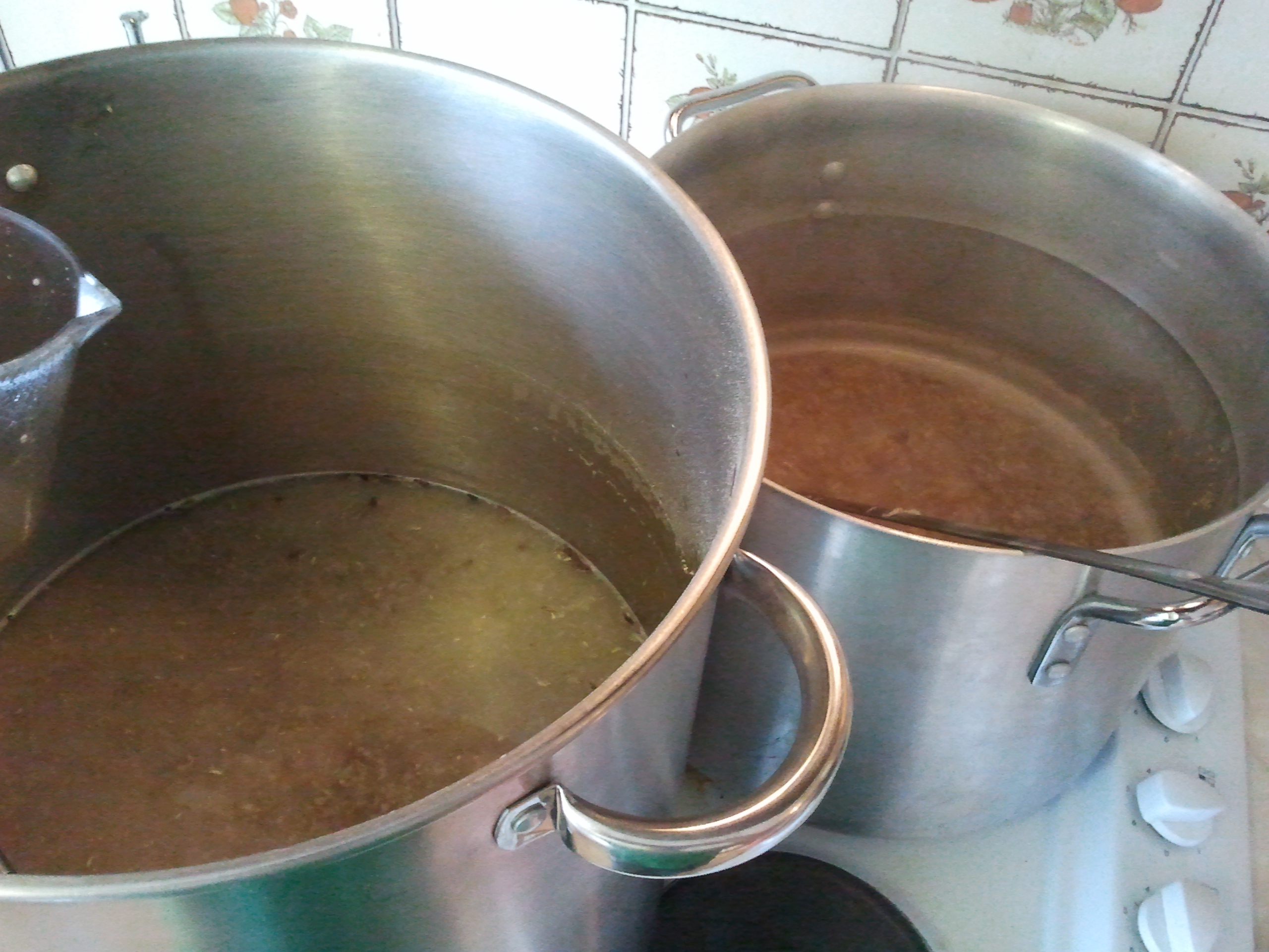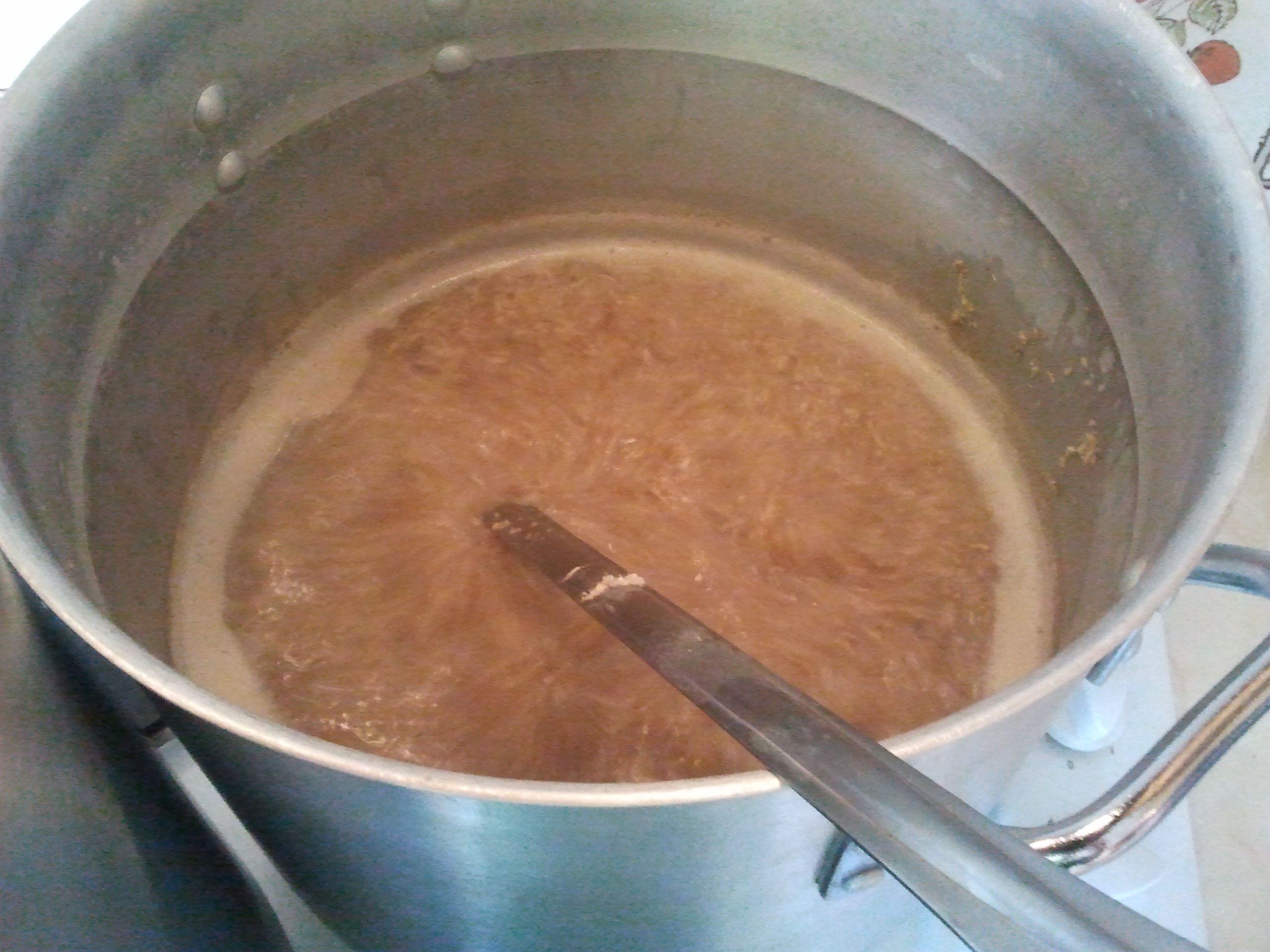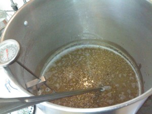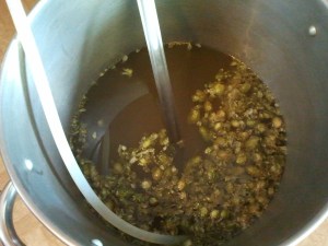60/40 ratio for Pilsner and Wheat malt mashed at a low temperature to ensure an extremely fermentable beer. Since we stove top mash in our kettle, we crushed the grain over the kettle to spread malt dust all over it (you’ll see why we did this in a minute). We mashed in with 1 1/2 gallons of hot liquor (water) to the 5 lb’s of grain the mash tun was only a quarter of the way full (first time ever!). After 20 minutes from mashing in we added 1 oz of Hersbrucker hops and according to our calculations that will bring us to 3 IBU’s of bitterness..craziness! Our total time for mashing our grains was 90 minutes to ensure full conversion of the starches into precious sugars. We then transferred the mash into our lautering tun and began fly sparging into the unwashed kettle. It still has dust from the middle on up from when we crushed the grains and had some left over grains from the transfer. This will give the Lactobacillus a head start on the brew because by the time the wort hits the kettle it’s at a temperature of 120F. Which is the prime temperature for Lactobacillus to to it’s job of inoculating the wort, now it all makes sense! (as a side note, we sanitized anything that came into contact with this brew to prevent other nasty’s in getting into this brew) We’re also not boiling this brew to prevent DMS (a corn-like off flavor) since this is supposed to be a clean-crisp-refreshing beer. To ensure Lacto does get inoculated in this brew we’re also tossing in a handful of grains as we sparge into the kettle. Our starting OG for this brew is 1.028 @ 5.5 gallons, SRM (color) 2, and the IBU’s (bitterness) is around 3 (calculated), and 84% brewhouse efficiency!