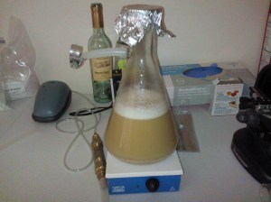 So what are these wild critters that I speak of? Well, I won’t go into specific strains for there are far too many to list but I will give a general idea of what they are. These include Brettanomyces, Pediococcus, Lactobacillus, Enterobacteriaceae, and Acetobactor. I won’t go into the nitty gritty of the characteristics on the wild critter’s except for one as this is the critter that we’re focusing out attention on today in the brewhouse. We’re seeking to brew a Berliner Weisse and this beer is very unique as it focuses on a symbiotic relationship between S. Cerevisiae and Lactobacillus delbrueckii or other strains of Lactobacillus. But where does one get a hold of this known beer spoiling organism? Well, there’s numerous of places in your house where you can obtain this critter. Do you have cabbage or cucumbers in your fridge? Well, chances are that you have Lactobacillus. Got some Pilsner/2-row/6-row malt laying around? Odds are you got Lactobacillus there too. Got some yogurt with live culturs in it? You definitely got your Lactobacillus in there (I’ve never tried this before, although it’s frowned upon through this route…). In short, you have Lactobacillus in your house or brewery already. Generally most homebrewer’s and brewmasters do everything in their power to avoid this critter. Or if you’re lazy you can just buy a pure Lactobacillus culture from White Labs or Wyeast.Lactobacillus is actually a very temperamental organism, it doesn’t like oxygen, cold temperatures, and hops (for the most part). There are some hop resilient strains out there, but White Labs and Wyeast strains do not like highly hopped beers. We’re taking out chances by obtaining our Lacto bug from Brewferm Pilsner malt. This particular batch is very dusty so we’re very curious on how this will turn out. Our yeast strain of choice to ferment this out is WLP 001 Cali Ale yeast from White Labs. It’s on a stir plate at high-krausen as we’re brewing today. We’re also trying out a lot of different brewing techniques today as the brew day progresses. For example, we’re mash hopping this beer with low alpha-acid hops (Hersbrucker), we’re single decocting this brew and proceeding with a no boil as well. This is our smallest grain bill we’ve ever brewed with as well! For this 5 gallon batch we’re only using 5 lb’s or grain with a 60/40 ratio of Pilsner/Wheat malt for this Berliner Weisse.