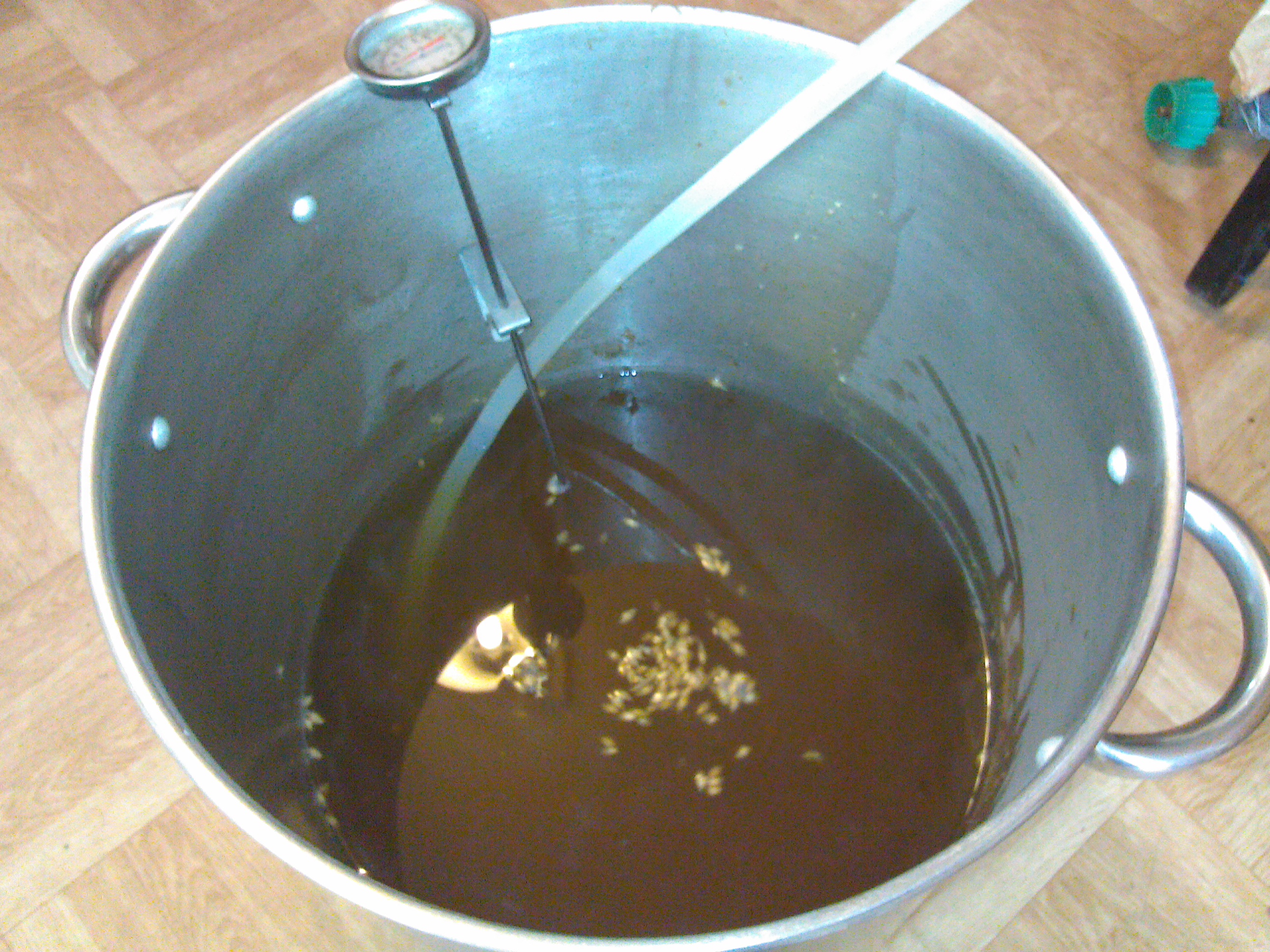 Kettle full of grain dust and hand full of grains while sparging, wort temp 124F.